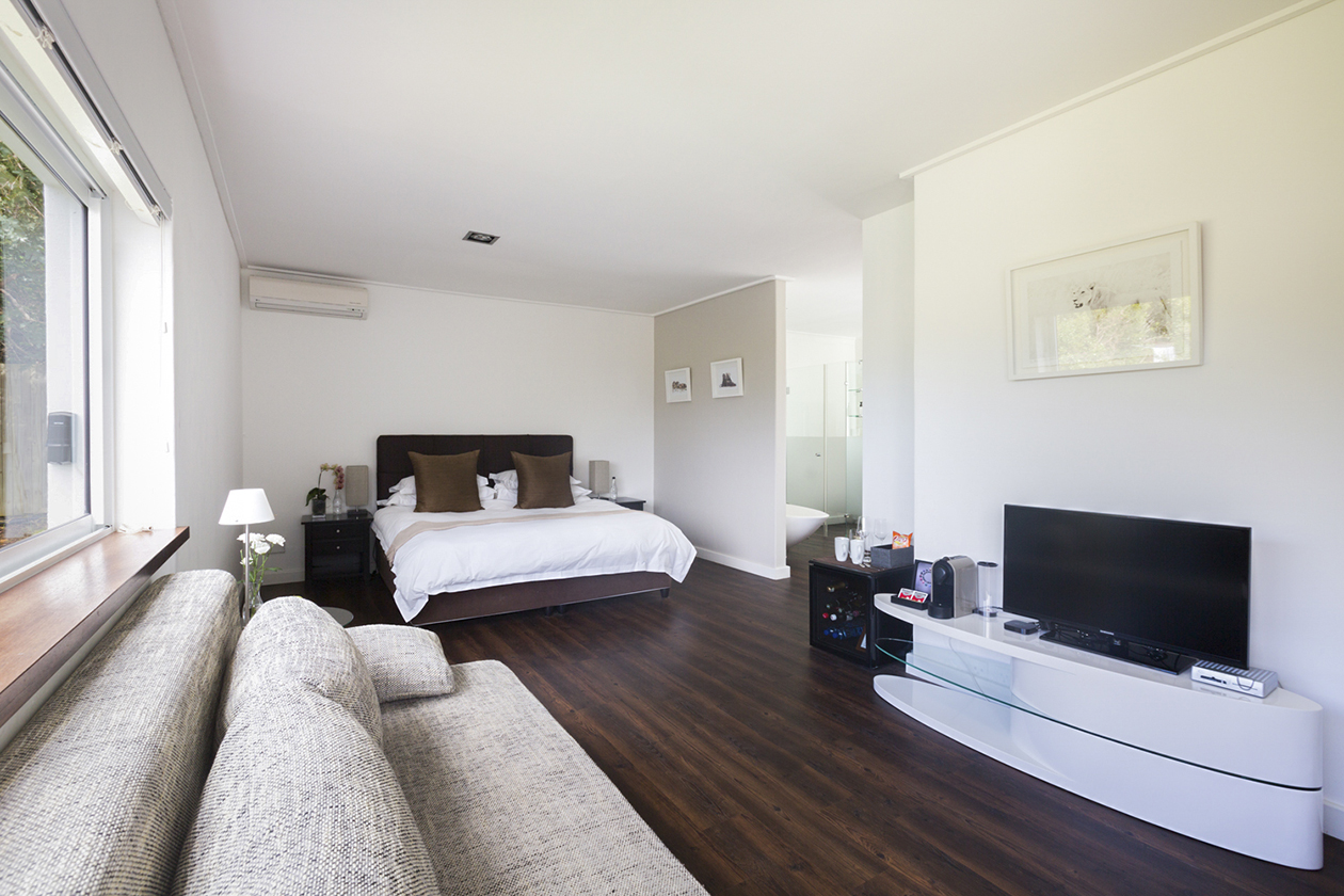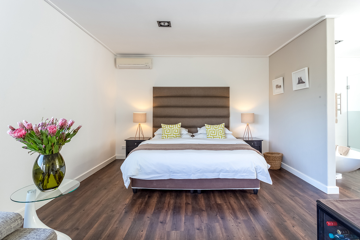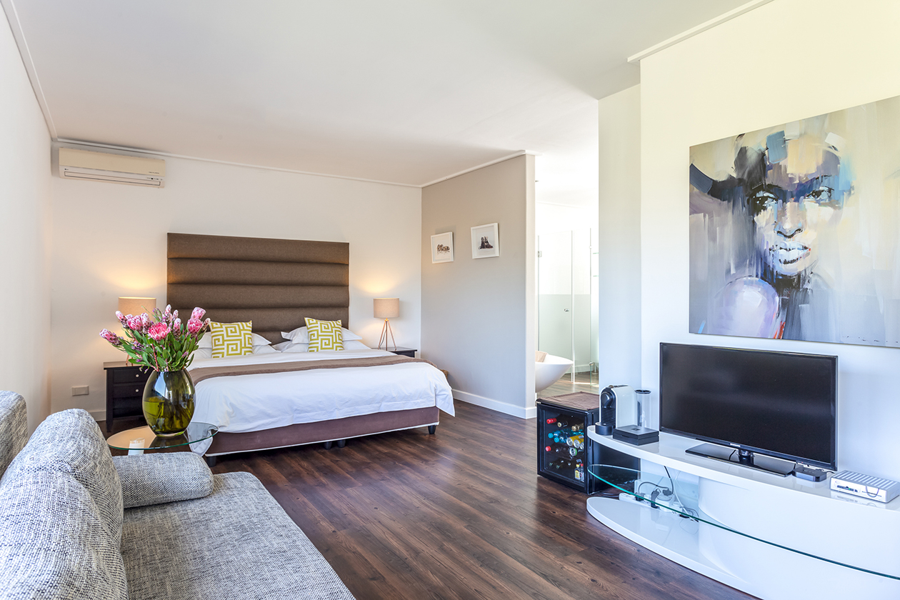 The commodious room can accommodate up to four guests. The open-space en-suite bathroom offers a free standing bathtub and a separate shower. From your private terrace, you get perfect views onto the ocean and the mountains.